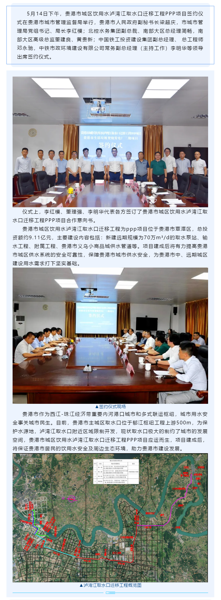 中鐵市政環(huán)境簽約貴港市城區(qū)飲用水瀘灣江取水口遷移工程PPP項目
