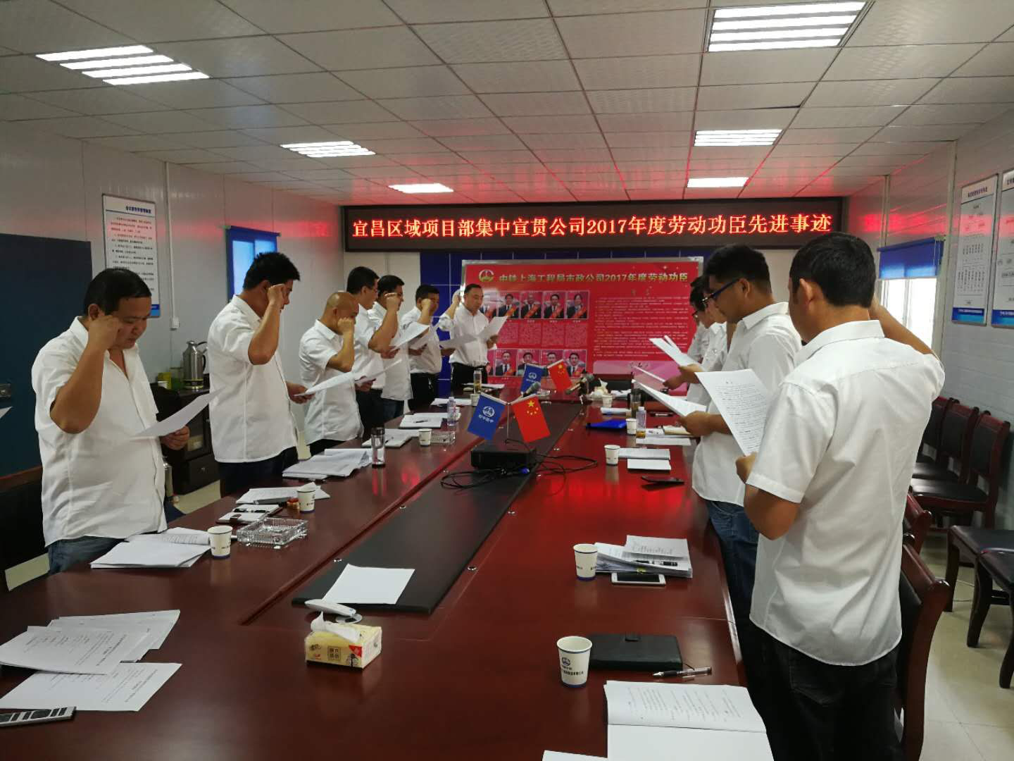 ☆4月19日,宜昌區域項目部組織干部職工宣貫公司2017年度“勞動功臣”先進事跡。宣貫會上,首先由區域項目黨總支書記向大家介紹了公司2017年度“勞動功臣”的先進模范事跡,督促各項目全體干部職工向“勞動功臣”學習,弘揚敢于爭先、勇創一流的工作精神,營造人人學當先進、事事爭做楷模的良好氛圍。隨后,由桔鄉路項目經理領誓,帶領大家莊嚴宣讀公司誓言。最后,全體與會人員依次在簽名板上簽名,表達自己向公司“勞動功臣”努力學習并付諸實踐的決心。(馮理欽)